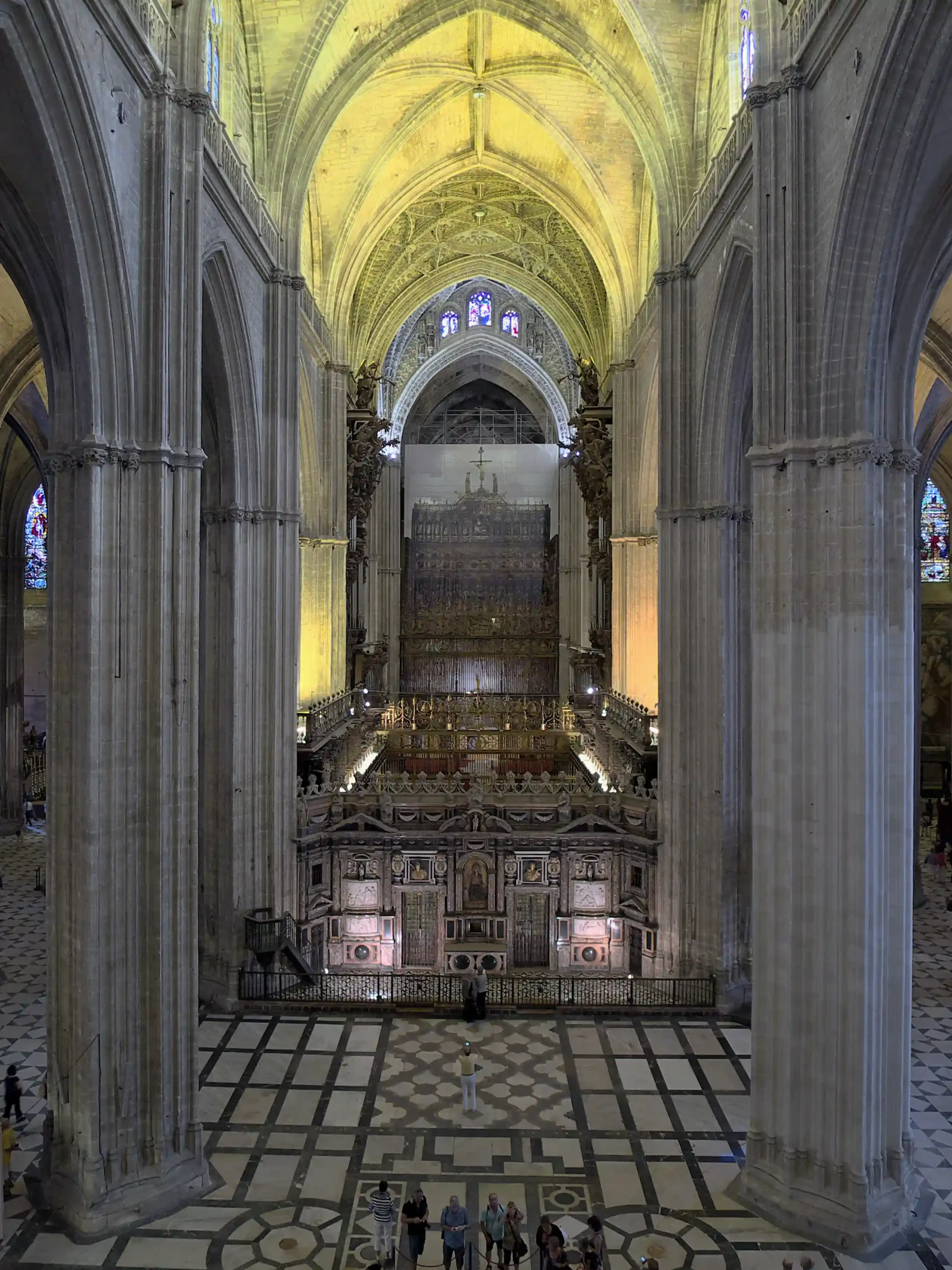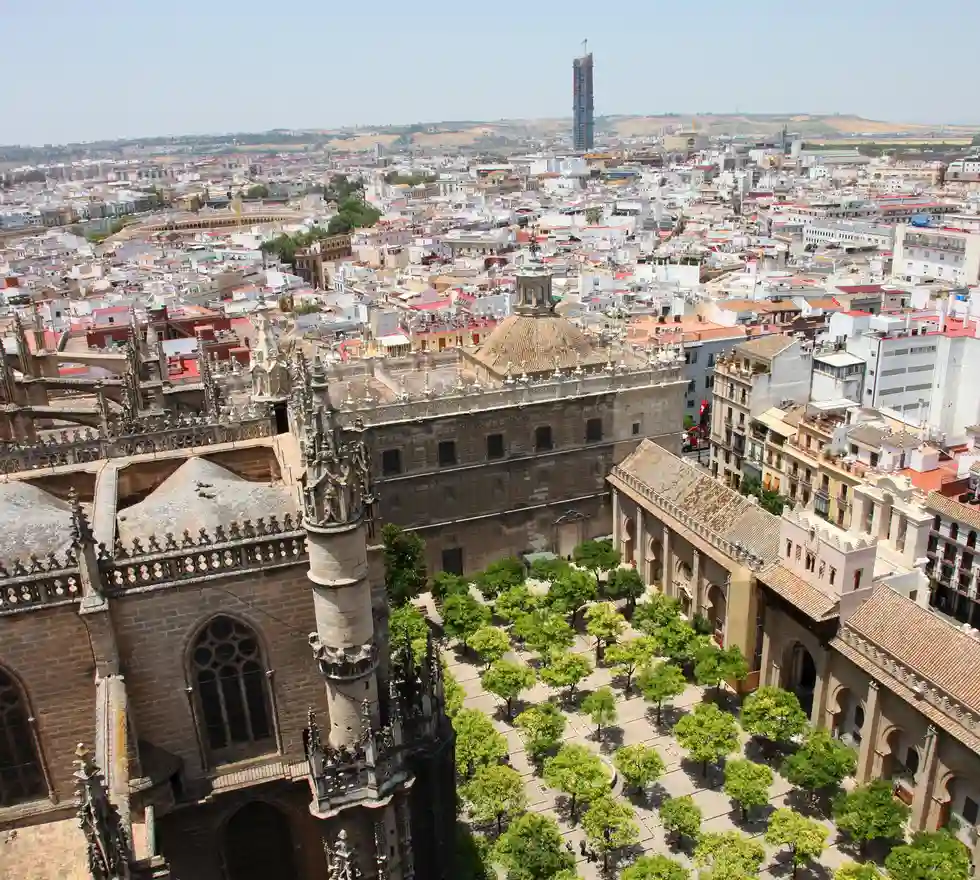 La Catedral de Sevilla ofrece una visita muy completa si vienes desde el albergue. Además de su interior monumental, merece la pena fijarse en varios puntos clave. La Puerta del Perdón, que da acceso al Patio de los Naranjos, es uno de los accesos históricos más reconocibles: un arco heredado de la antigua mezquita que marca el paso hacia el núcleo original del conjunto. El Patio mantiene su trazado medieval y funciona como antesala tranquila antes de entrar en la nave principal.