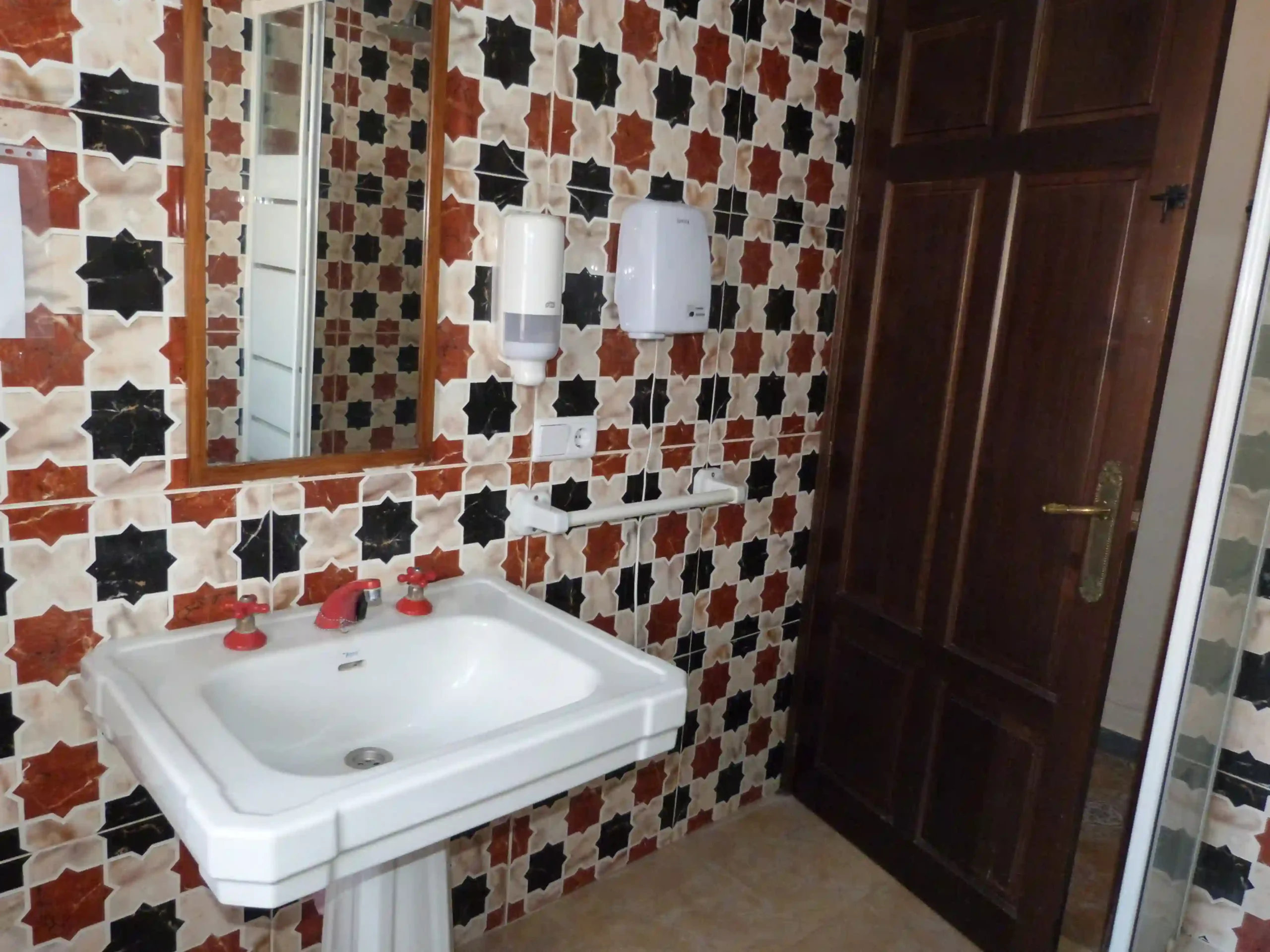 El lavabo incluye espejo y dispensadores de higiene, con espacio suficiente para el uso personal diario. Los revestimientos cerámicos, de estilo tradicional, son fáciles de limpiar y mantienen coherencia estética con el resto del alojamiento.