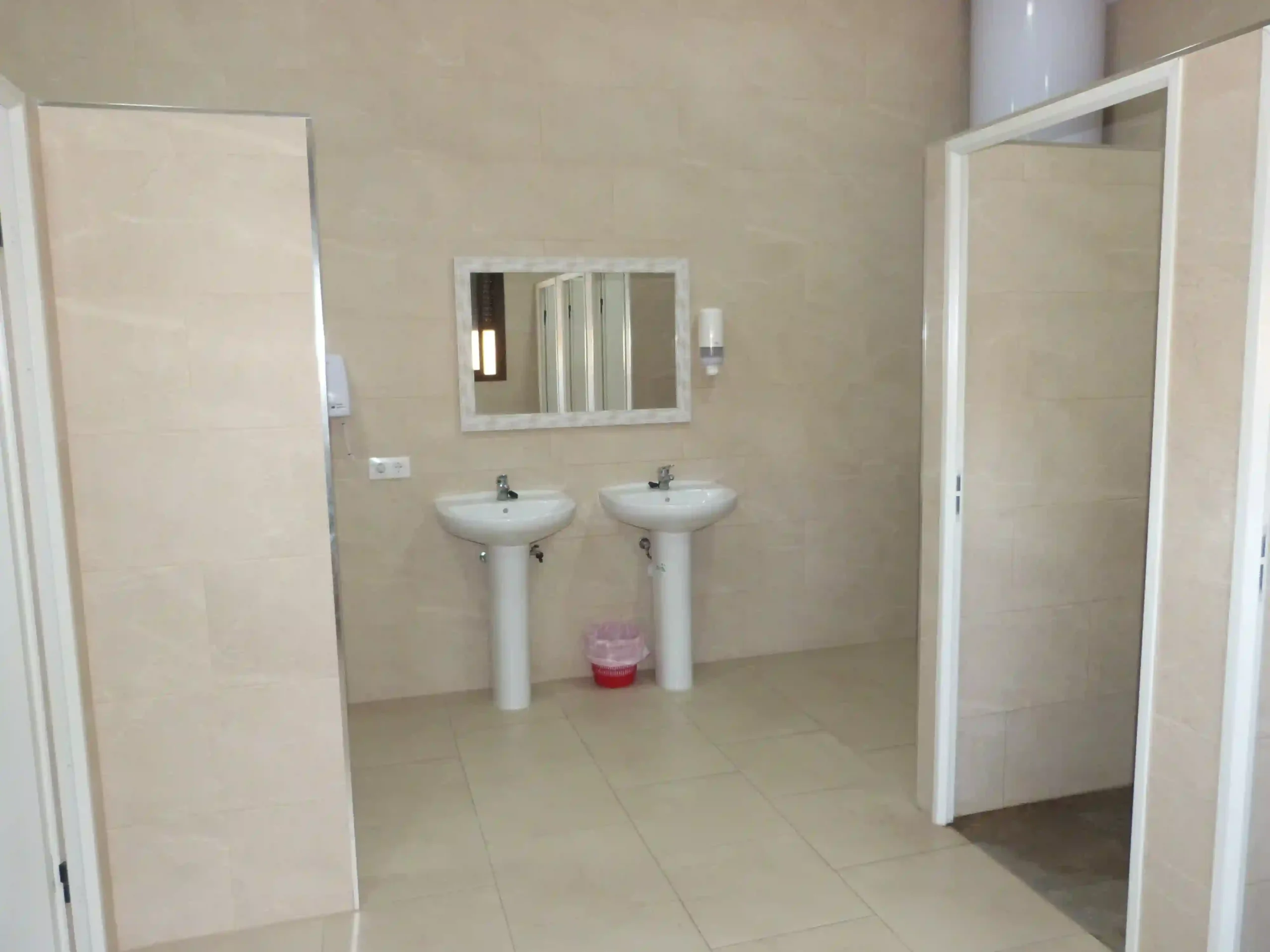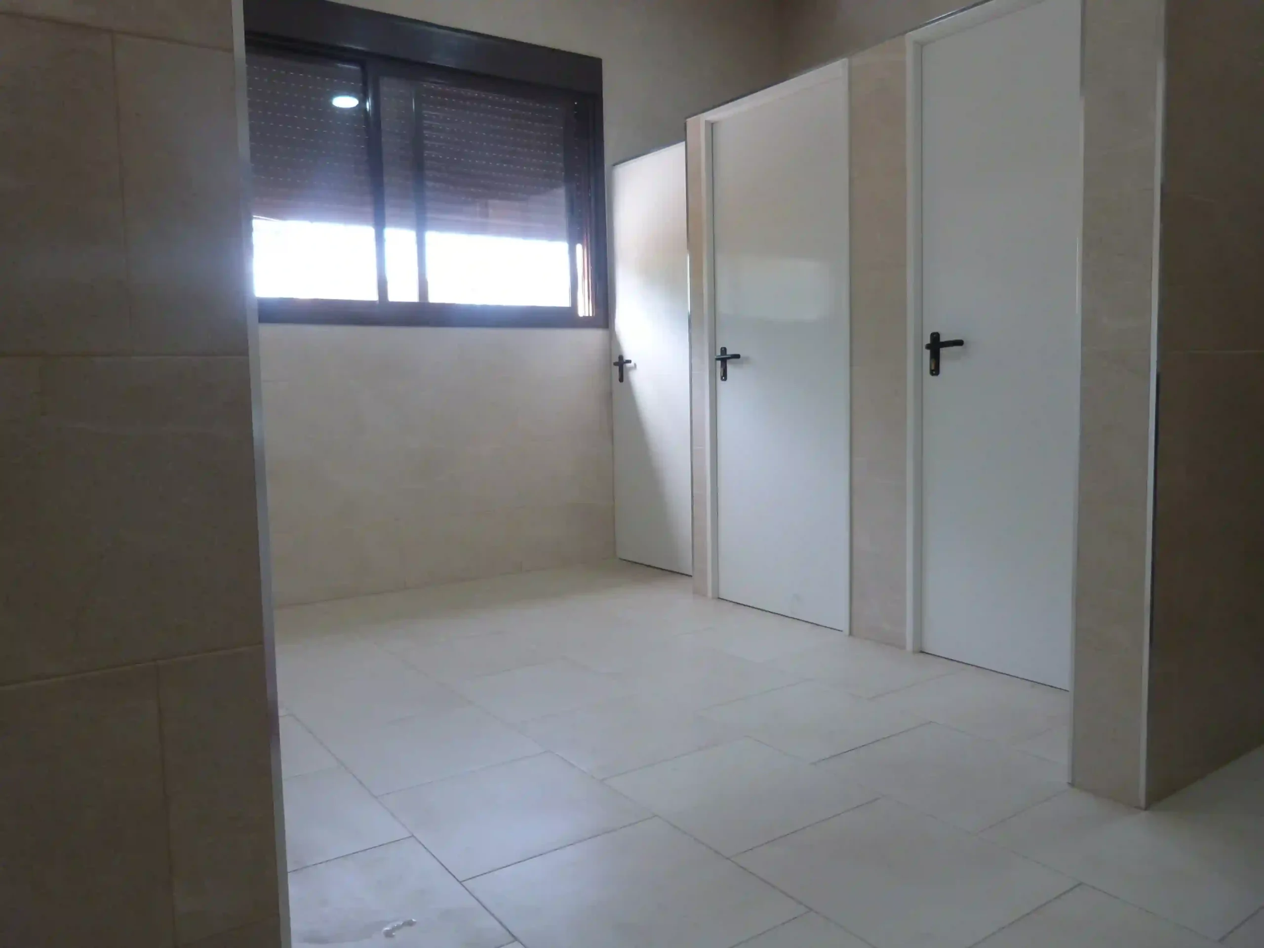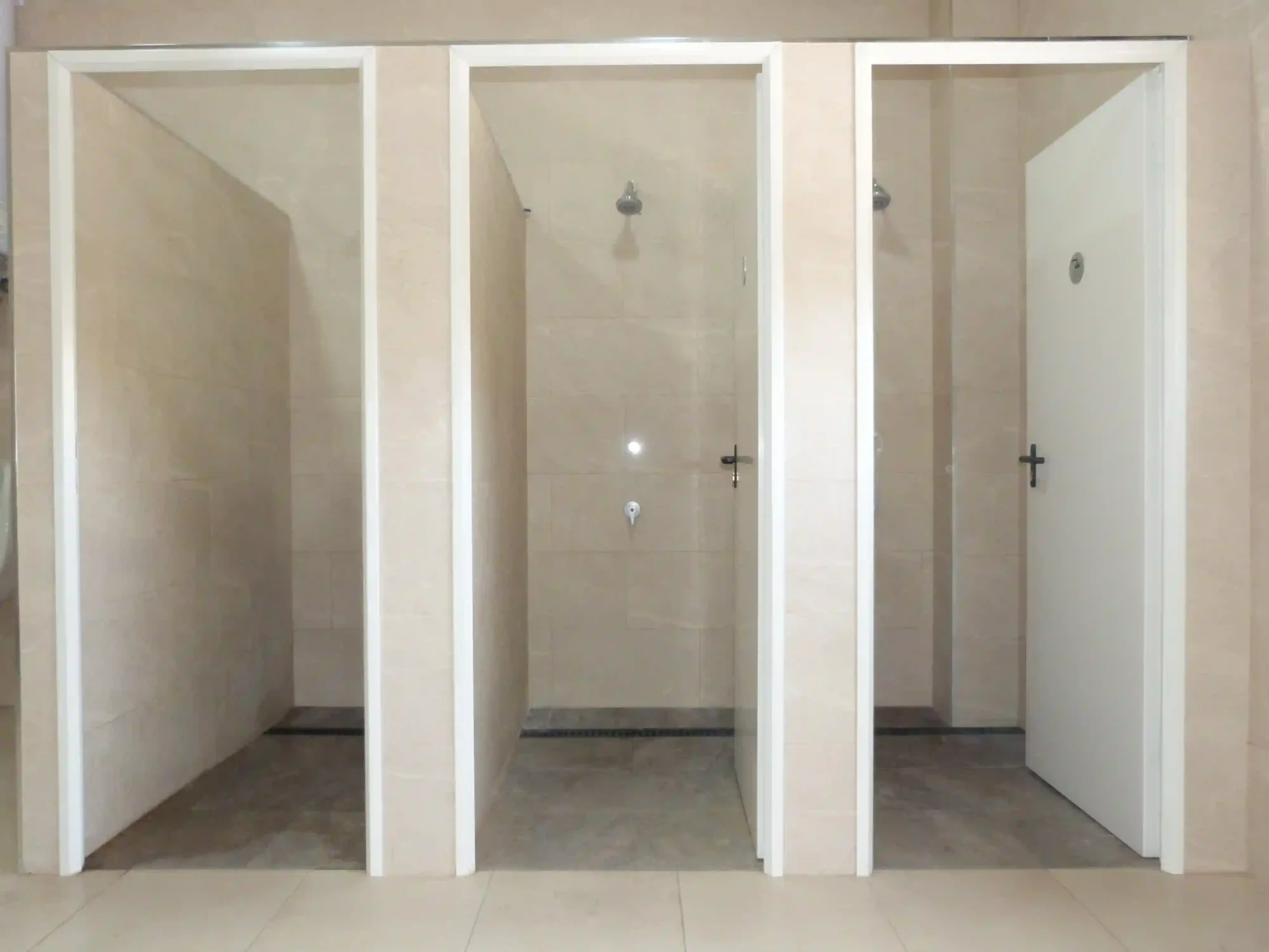 Las duchas están equipadas con plato a ras de suelo, buen drenaje y grifería sencilla y resistente, pensadas para un uso frecuente. Todo el baño está revestido con materiales claros, modernos y fáciles de limpiar, transmitiendo sensación de limpieza y amplitud.