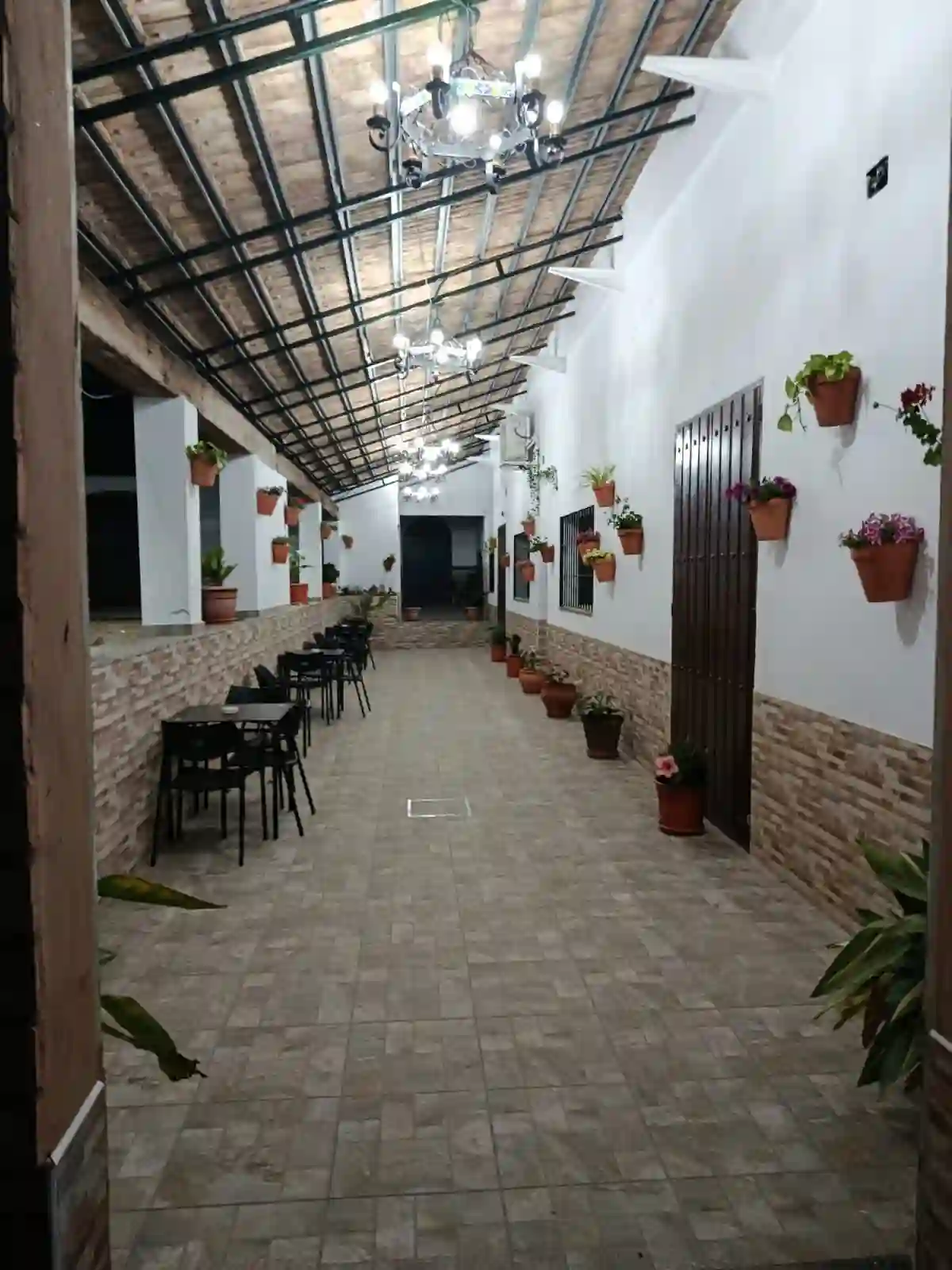 El porche es un espacio amplio y cubierto, pensado como zona común de descanso y encuentro. Mantiene la estética tradicional andaluza, con techo alto de vigas vistas y estructura abierta que permite una excelente ventilación natural durante todo el día.