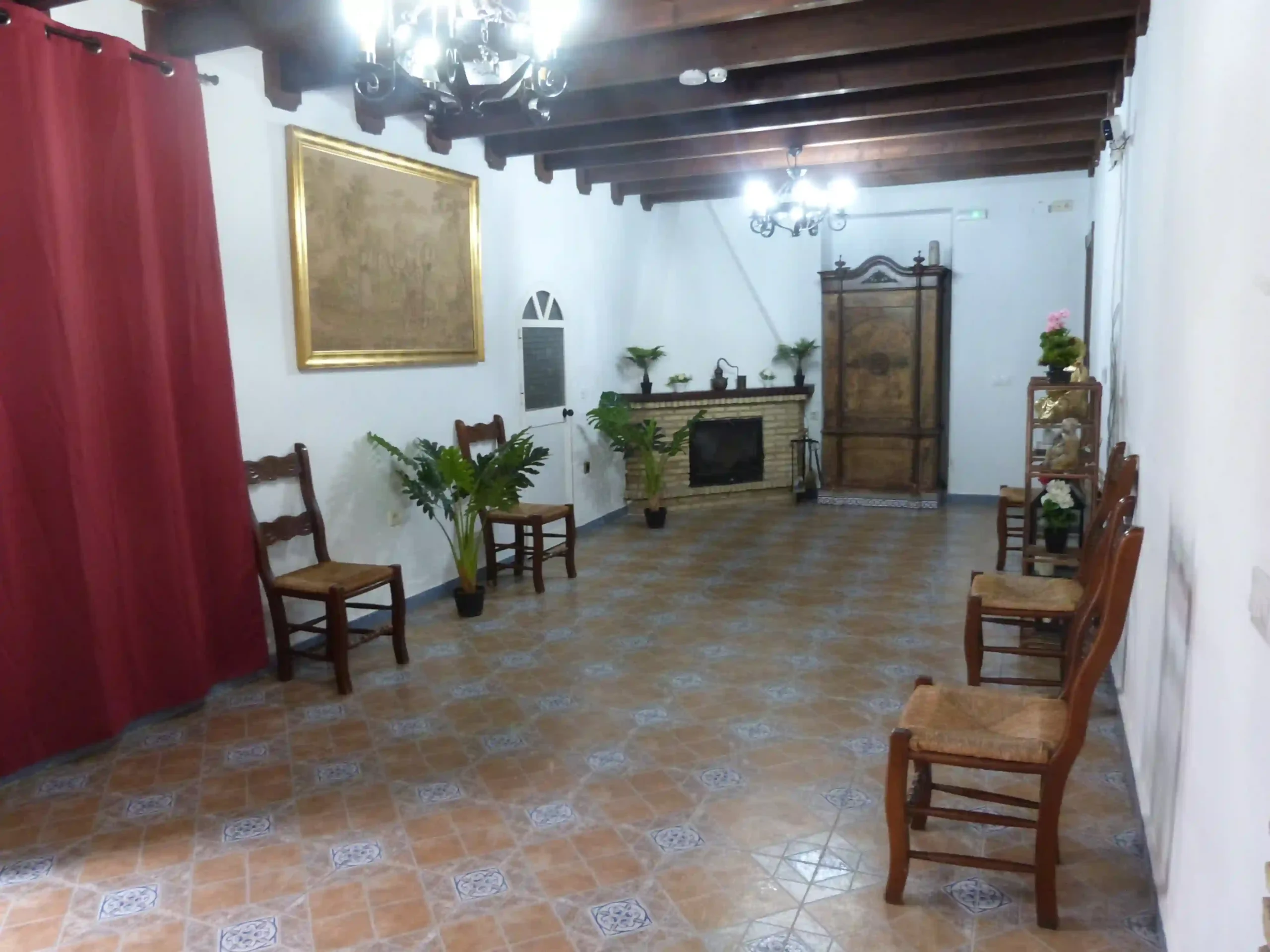 Destacan los elementos decorativos clásicos, como muebles de madera maciza, cuadros y detalles artesanales, que refuerzan el carácter histórico y acogedor del lugar. La iluminación es cálida y suficiente, combinando lámparas de estilo tradicional con una buena distribución de luz general.